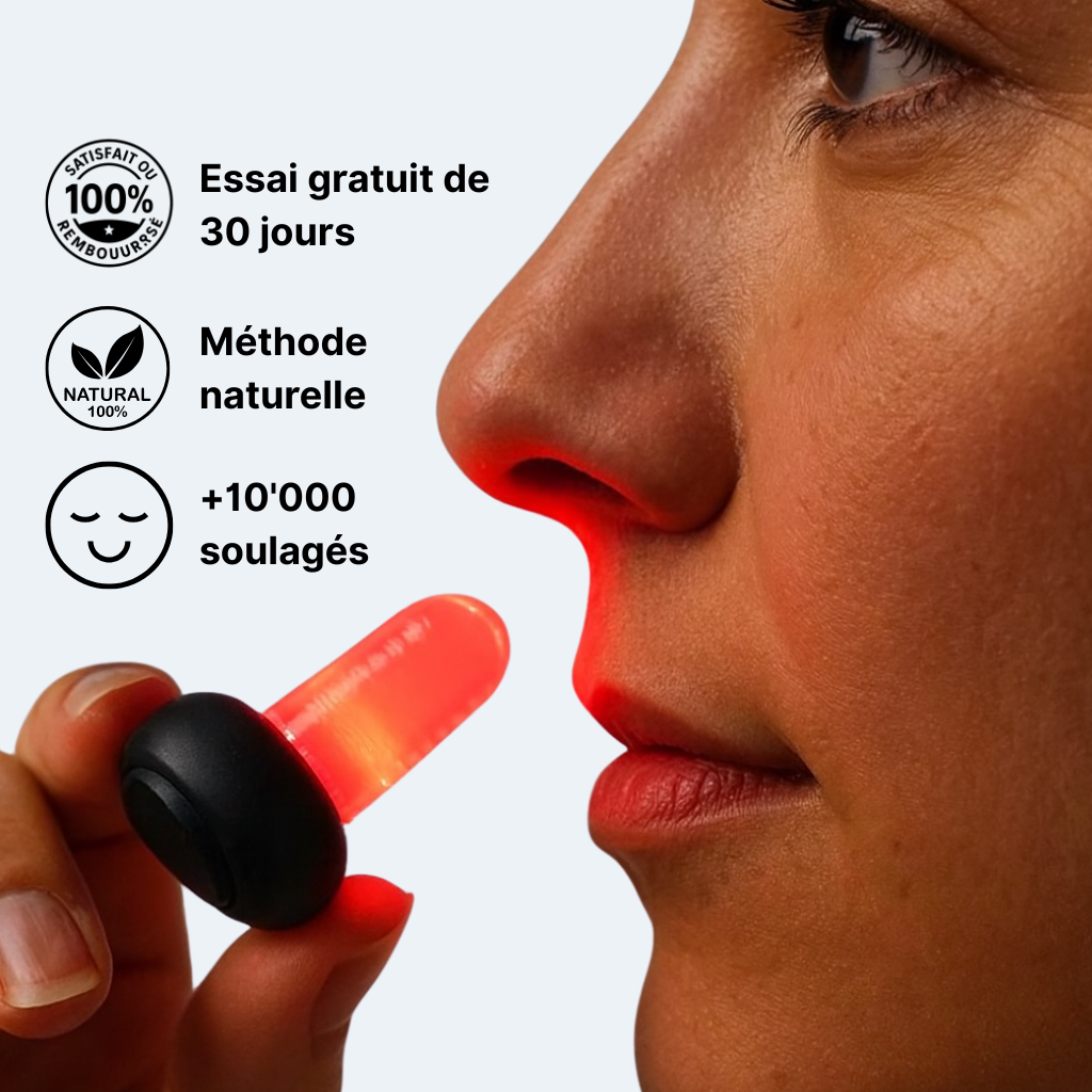 Nos recherches nous ont conduits à la photobiomodulation : une lumière précisément dosée, quelques minutes par jour, pour aider à libérer les sinus et aborder le quotidien avec les sinus libérés. Essais après essais, retours d’utilisateurs, optimisation des embouts et du minuteur : nous avons façonné un rituel simple et efficace, facile à garder dans sa routine.